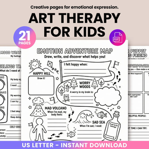 This bundle includes 21 printable art therapy worksheets designed specifically for kids. Activities focus on drawing, doodling, coloring, and simple written reflection. Pages are black and white, easy to print, and include spacious layouts that are not text-heavy or overwhelming.